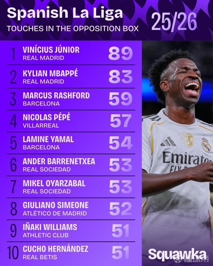 本赛季西甲对方禁区内触球次数最多榜:维尼修斯89次领跑榜单